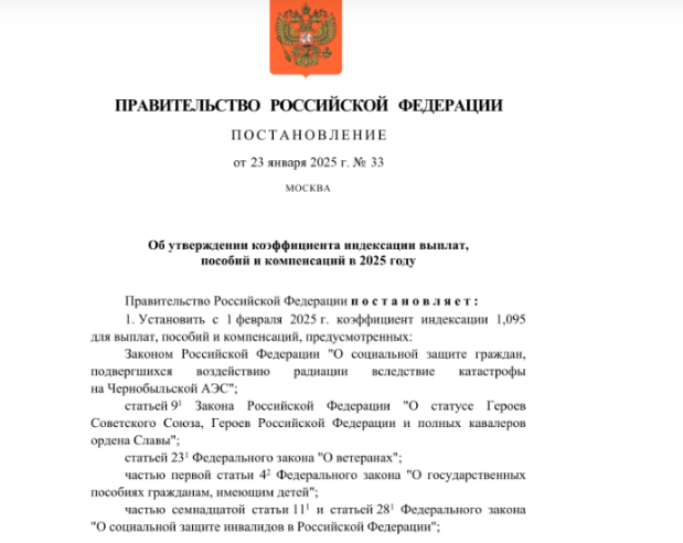 На основании Постановления 33 о 23.01 индексировать выплаты ветеранам будут на 9,5% или в 1,095 раза.